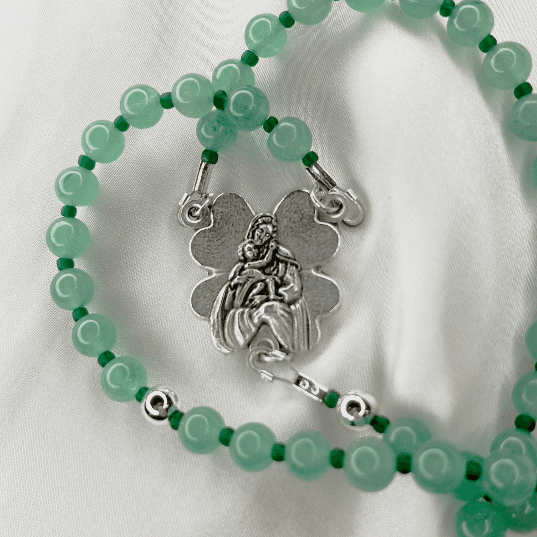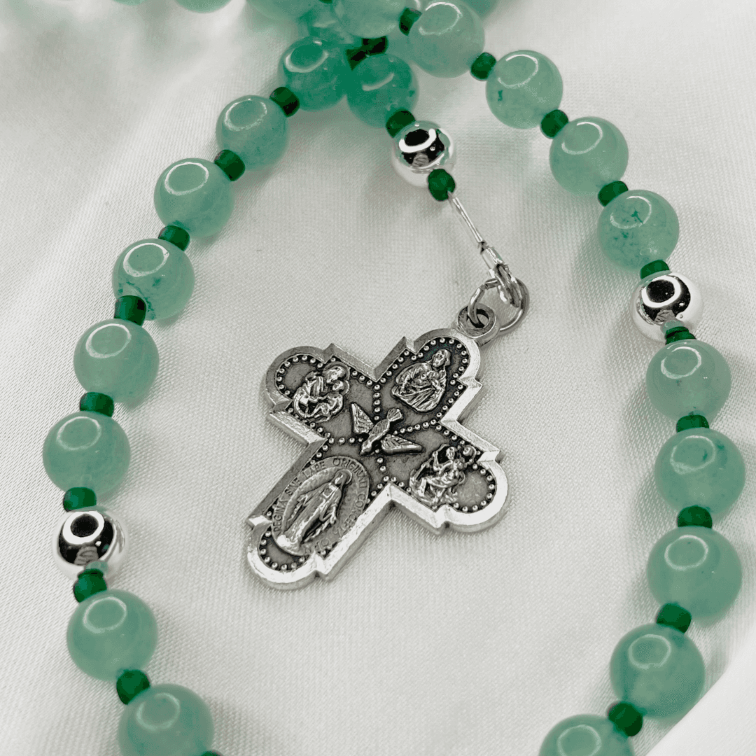 - Translucent green beads with a soft, calming finish - Deep green spacer beads for contrast and harmony - Scalloped Marian centerpiece with detailed relief - Multi-symbol silver crucifix with sacred imagery - Balanced, durable construction for daily use - Handcrafted with care and intention