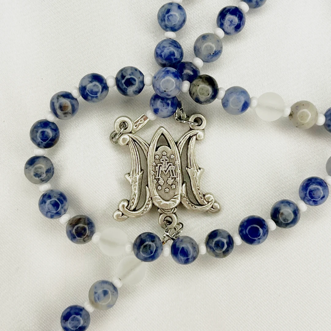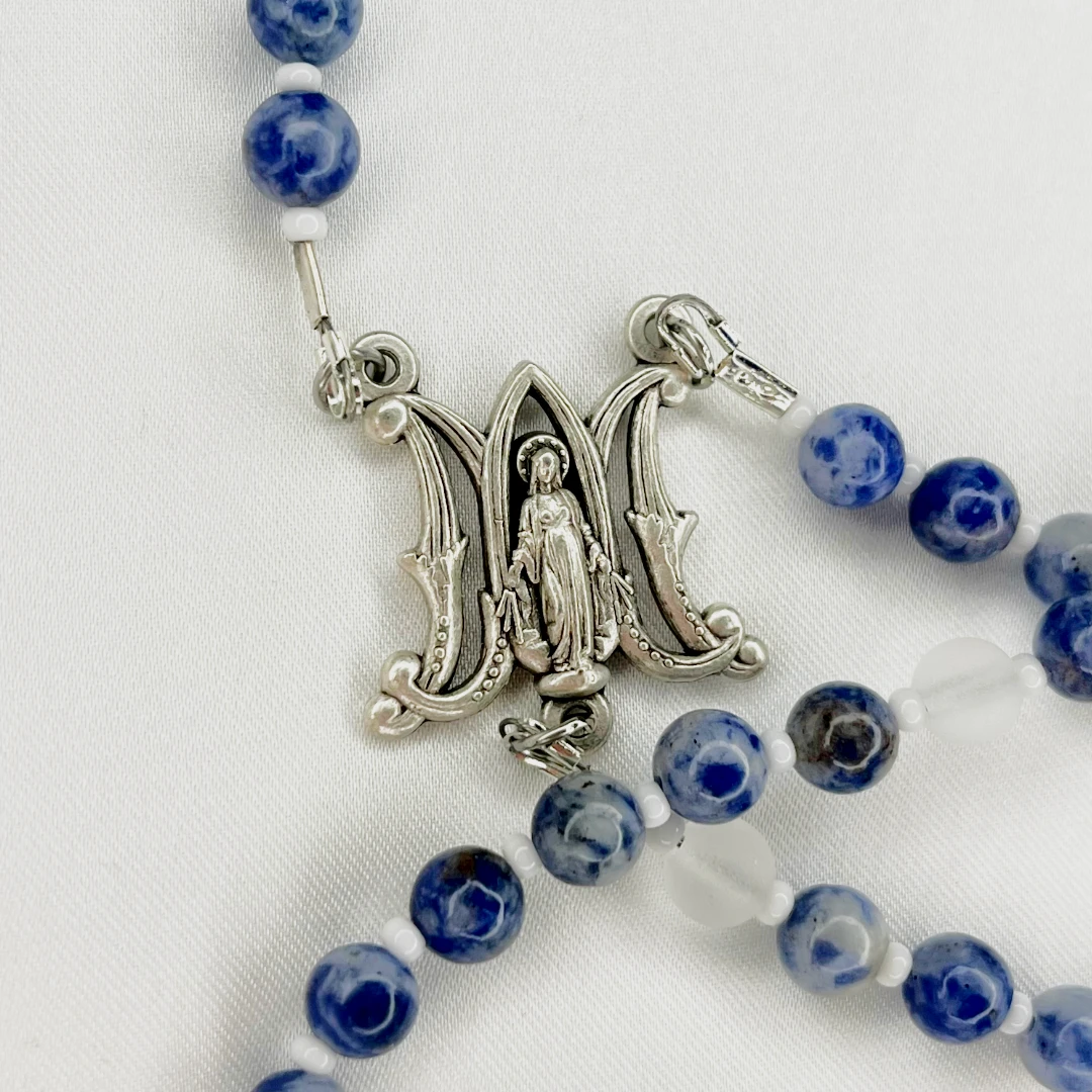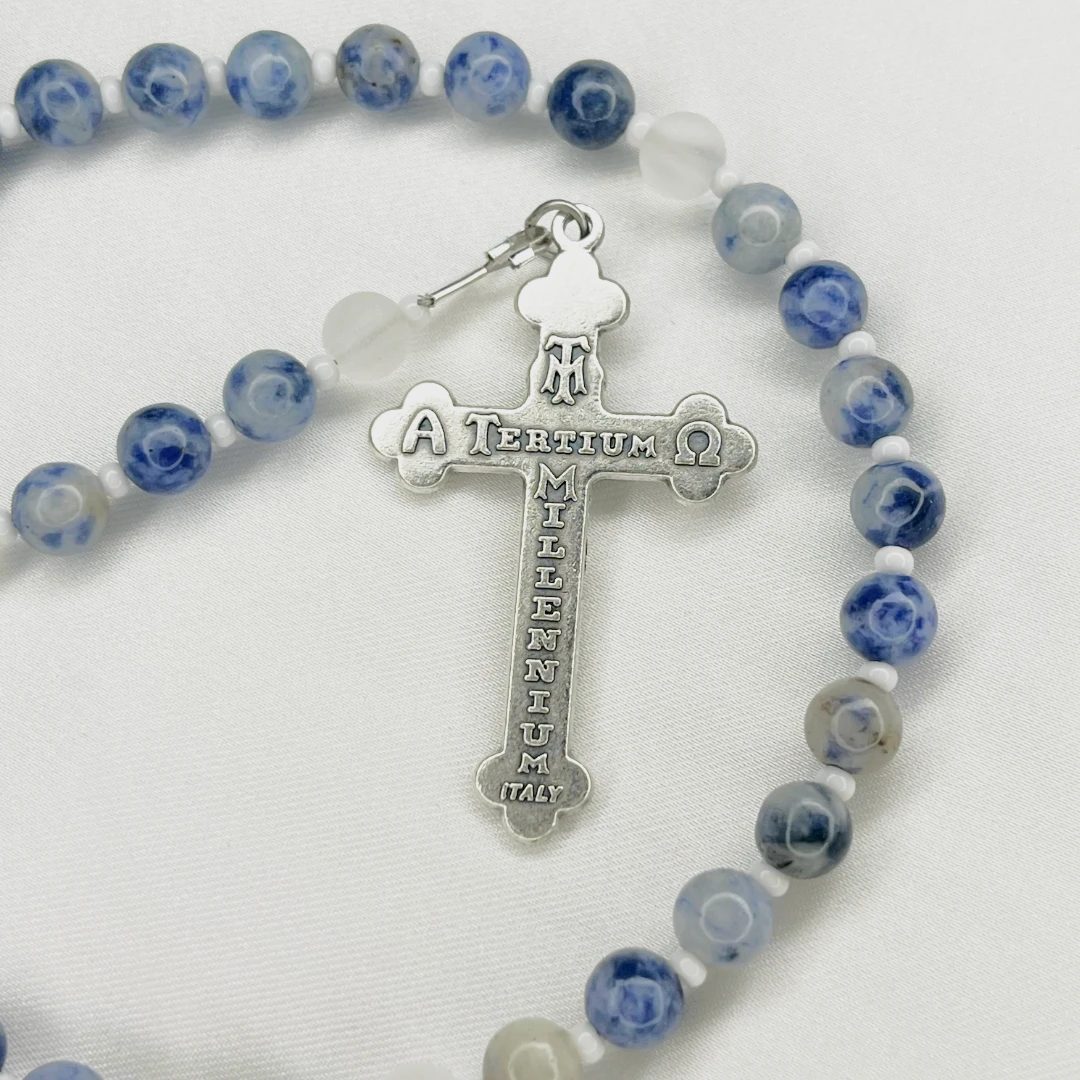 - Natural stone beads in Marian blue tones - Frosted white beads for balance and clarity - Italian Tertium Millennium crucifix - Gothic-style Marian centerpiece - Strong, durable construction for long-term use - Handcrafted in Iceland