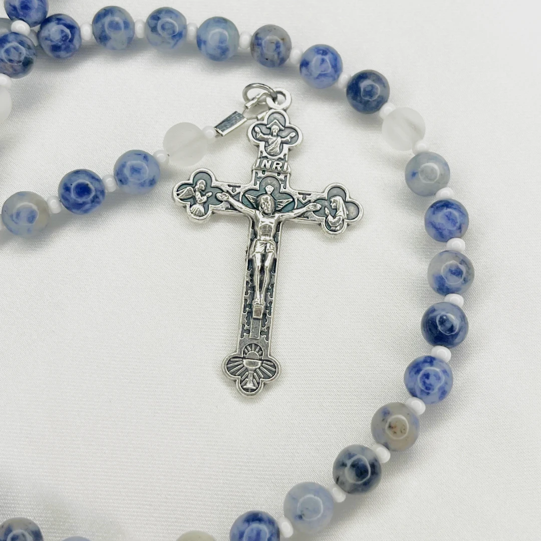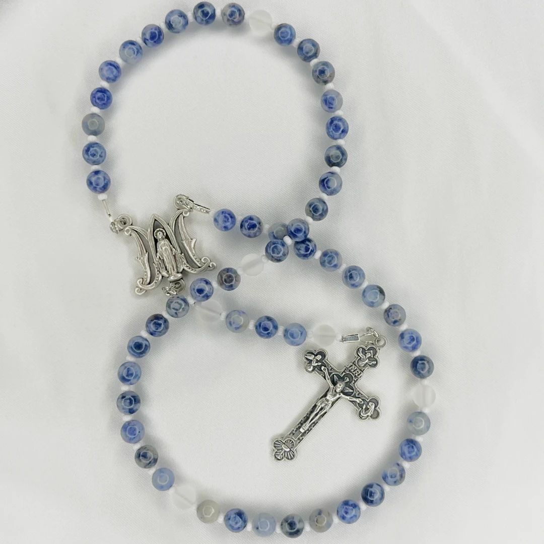 - Beads: 8 mm natural stones + frosted beads - Length: Standard 5-decade rosary - Colors: Blue, white, silver - Suitable for baptisms, confirmations, weddings, Christmas, or personal prayer