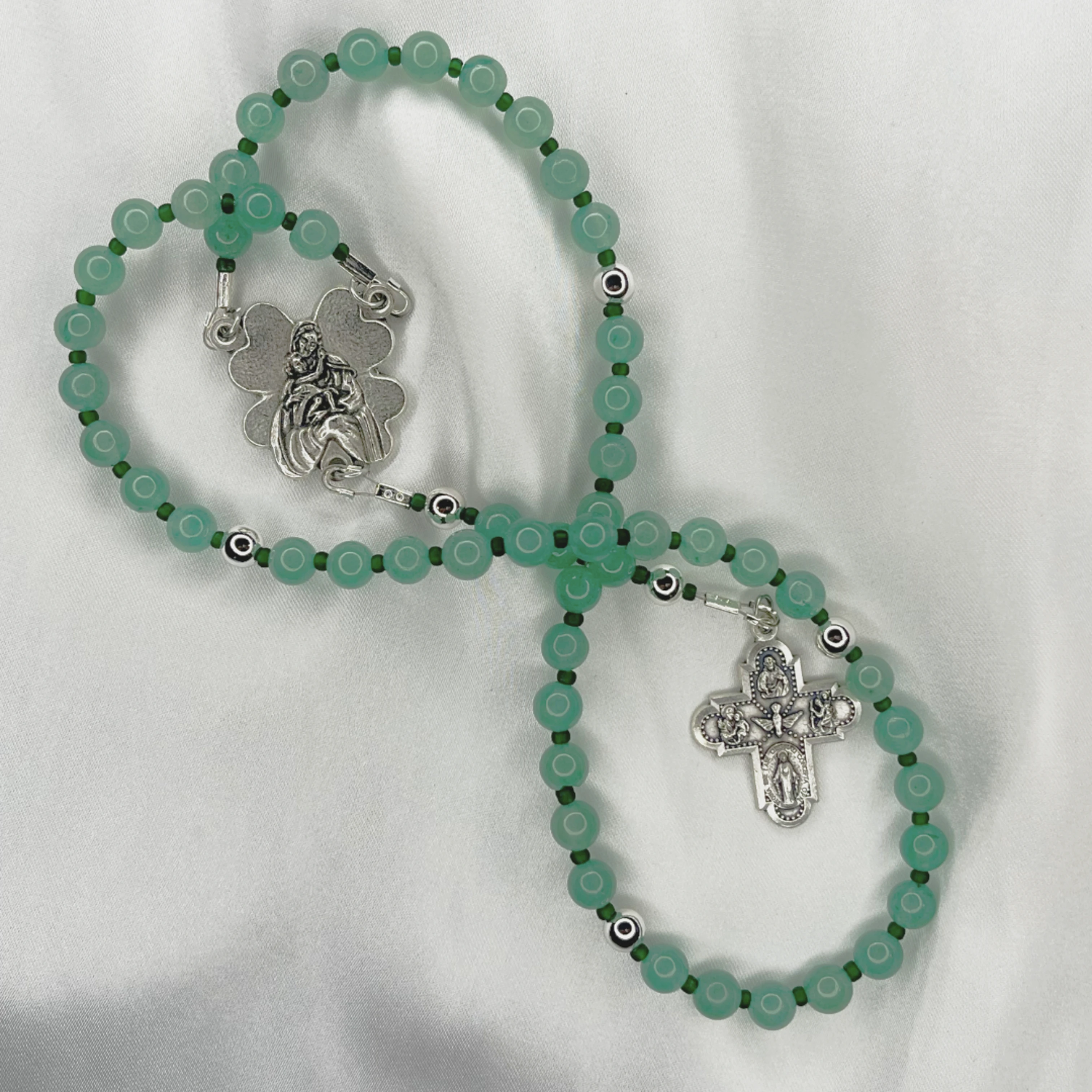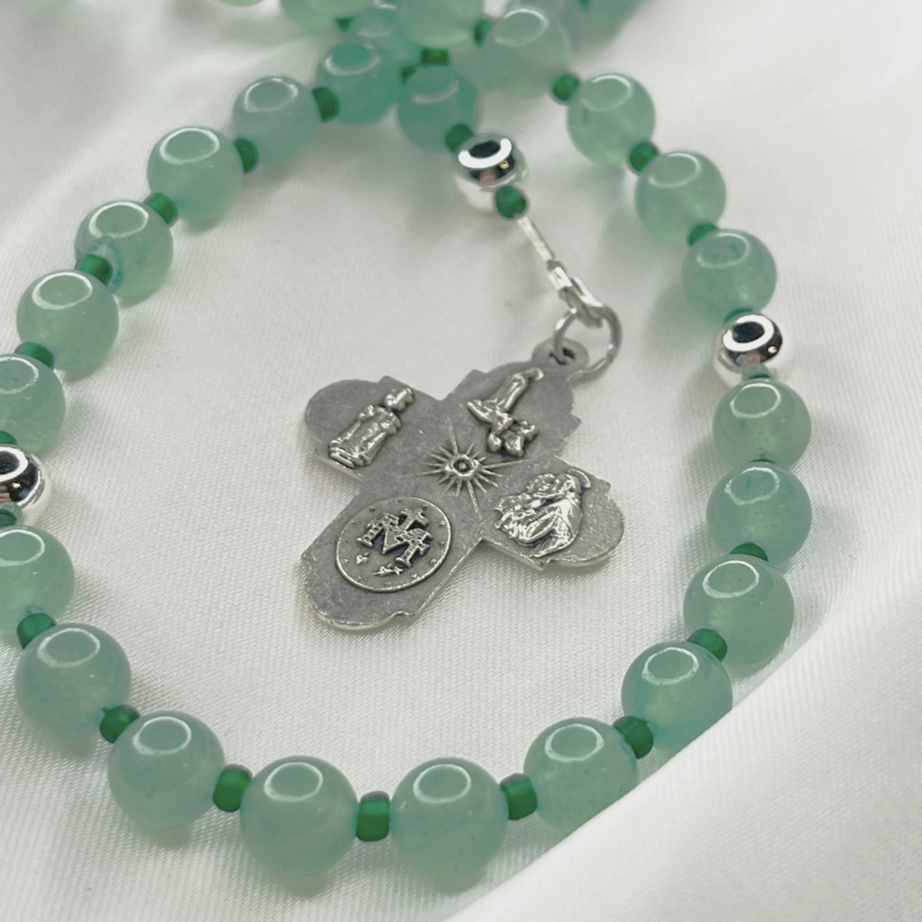 - Translucent green beads with a soft, calming finish - Deep green spacer beads for contrast and harmony - Scalloped Marian centerpiece with detailed relief - Multi-symbol silver crucifix with sacred imagery - Balanced, durable construction for daily use - Handcrafted with care and intention