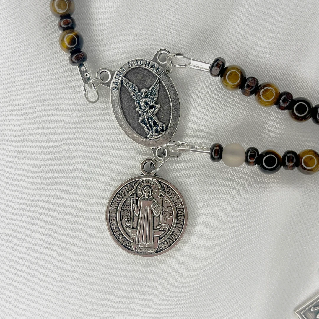 This rosary is built around protection, steadiness, and resolve. Earth-toned beads in deep browns, amber, and black create a grounded, rugged rhythm, balanced by soft neutral separators that invite calm and focus in prayer. At its center stands Saint Michael the Archangel, a symbol of defense and spiritual courage, paired with a Saint Benedict medal known for protection and blessing. The rosary is completed with an Assisi-style crucifix, engraved with sacred text and imagery, giving the piece a strong monastic character. This is a rosary made for those who carry their faith quietly but firmly.