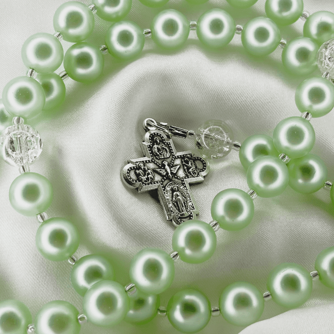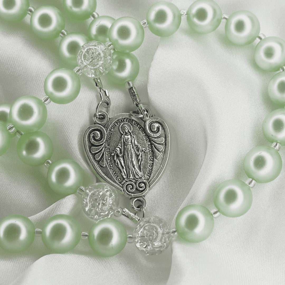 This Catholic rosary is crafted with mint-green pearl-style beads, offering a calm and balanced appearance. Clear crystal Our Father beads separate each decade, providing subtle contrast and structure to the design. The centerpiece features the Miraculous Medal of the Virgin Mary, paired with a finely detailed four-way crucifix, uniting traditional symbols of faith and devotion. A timeless rosary designed for daily prayer, quiet reflection, or as a meaningful religious gift.